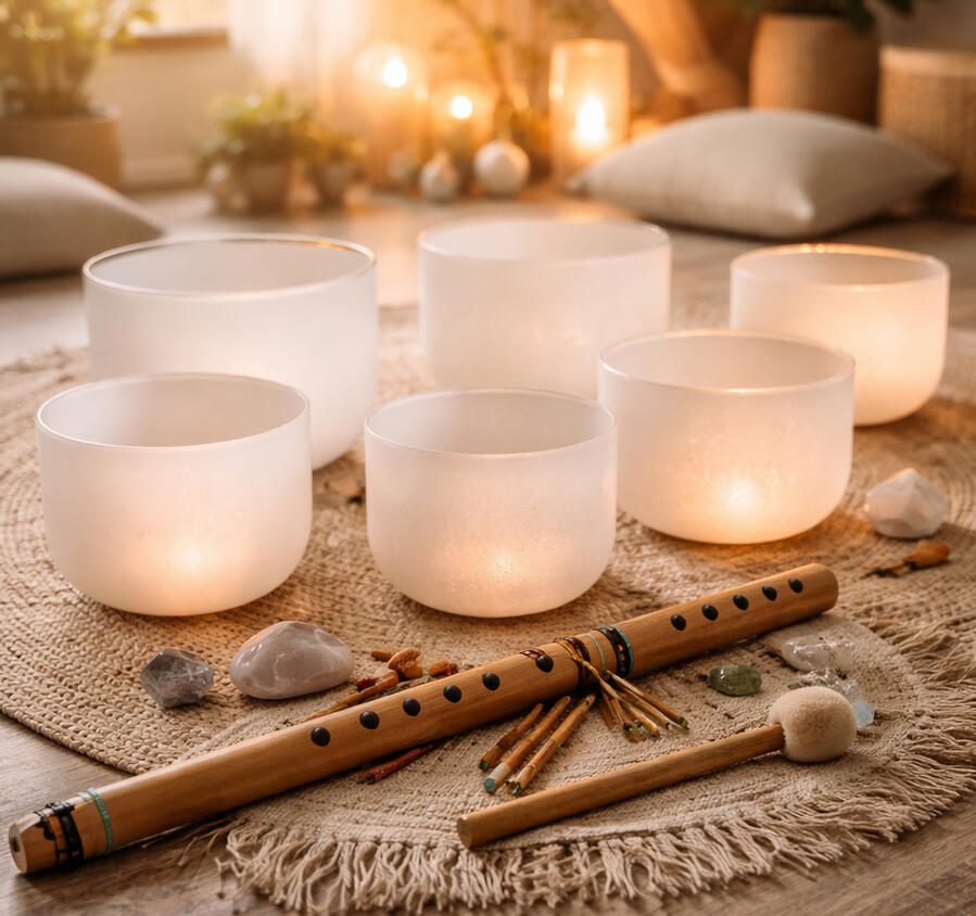 Sound therapy is a vibrational healing practice that uses sacred instruments like crystal bowls, flutes, and drums to guide the body and mind into deep relaxation. The frequencies help regulate the nervous system, release stored tension, and bring the body back into harmony.